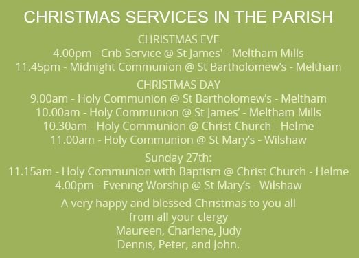 Christmas Services in the Parish Posted on: 22nd December 2015 by: melthamparish@outlook.com Come and worship with us this Christmas in Meltham, Helme, Wilshaw and Meltham Mills. Everyone welcome. Share this:Tweet Click to email a link to a friend (Opens in new window) Email Click to print (Opens in new window) Print