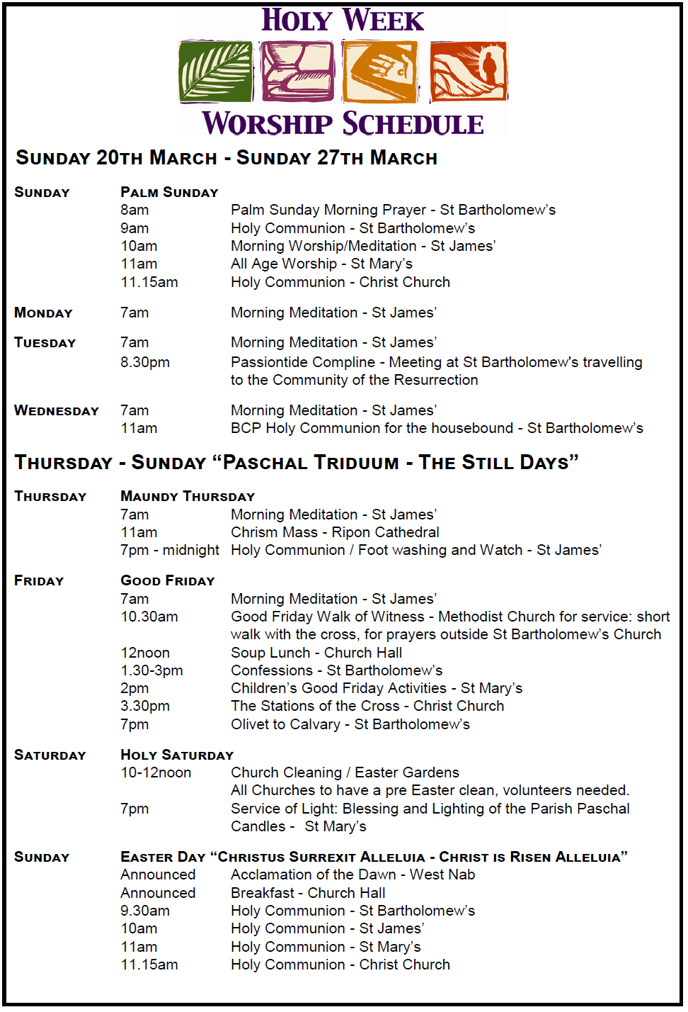 Holy Week 2016 in Meltham Posted on: 21st March 2016 by: melthamparish@outlook.com Lots of things going on during Holy Week in #Meltham. Join us for worship. All welcome! Share this:Tweet Click to email a link to a friend (Opens in new window) Email Click to print (Opens in new window) Print