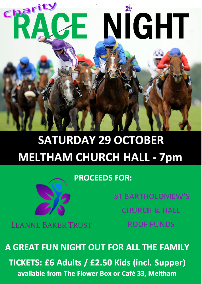 Join us for our Charity Race Night – proceeds for the #leannebakertrust and St Bart’s Church and Hall Roof Funds – Sat 29 Oct 7pm – tickets on sale at The Flower Box and Café 33 Meltham – £6 adults / £2.50 kids (incl. supper). Ales, wine and soft drinks on sale. A great fun night – bring all your family and friends – tickets limited so buy early and don’t miss out.