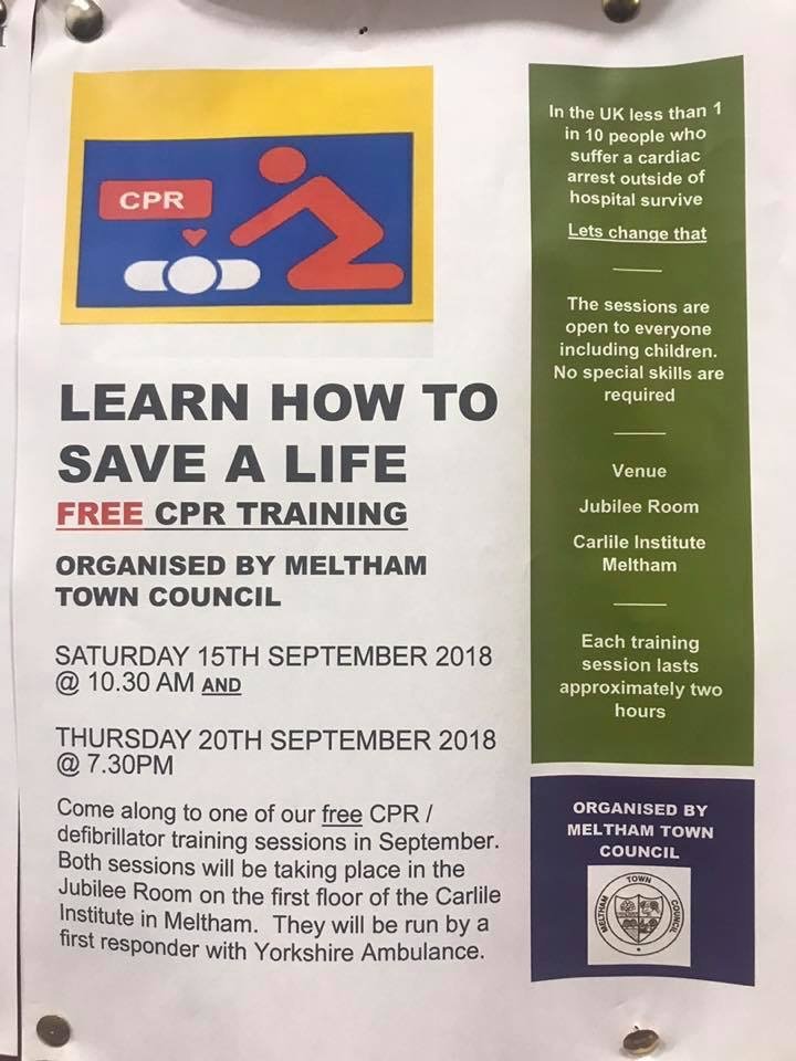 Learn how to save a life – free CPR and defibrillator training in #Meltham on Thursday 20 September – 7:30pm @ The Carlile Institute. Organised by the Town Council. The session will be run by a Yorkshire Ambulance first aid responder. Please share and join the session if you can make it – it might just save a life!